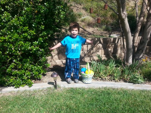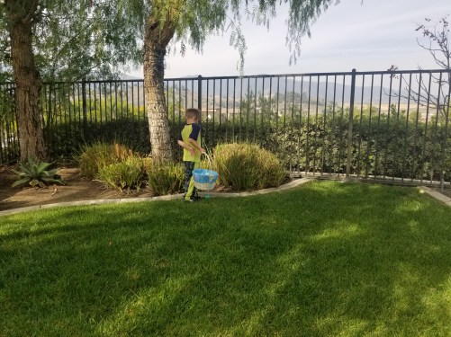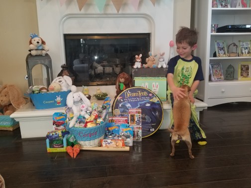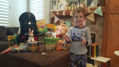 On Easter morning Cooper wakes up to an Easter Basket filled with little toys and some candy too. He takes his time looking through his basket. When he’s done, we go into our backyard to find all the eggs the Easter Bunny hid! He’s always so excited to find all the eggs. They’re filled with candy so that’s always very exciting for him! After that we come inside and eat breakfast.